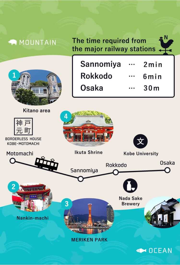 Borderless House Kobe-Motomachi offers excellent accessibility. It's just a 4-minute walk from JR/Hanshin Motomachi station and a 3-minute walk from Kobe Subway Kenchomae station. Sannomiya station is only a 15-minute walk away, making sightseeing and shopping effortless.